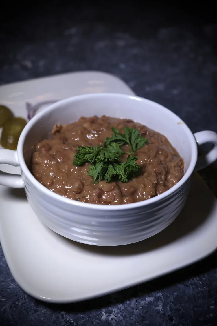 A classic Georgian red bean stew slow-cooked with herbs, onions, and aromatic spices, served in a traditional clay pot accompanied by Georgian cornbread and house pickles for a complete, authentic experience.