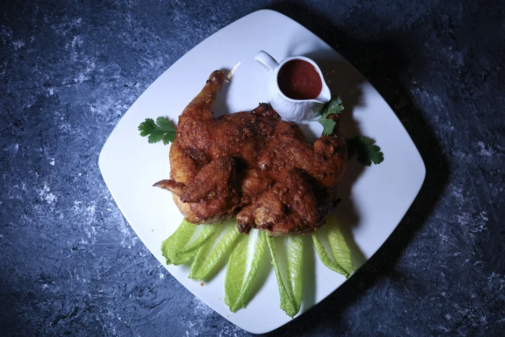 A Georgian classic, spatchcocked chicken pan-fried under weight for exceptional crispiness and succulent meat, paired with a vibrant red tomato sauce that adds a bright, savory kick.